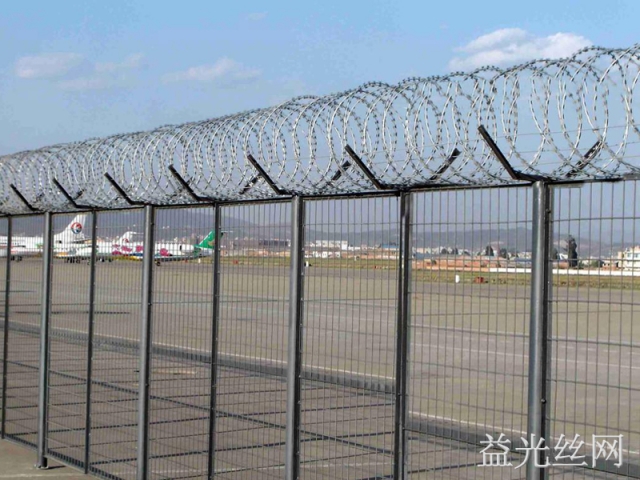 機場護欄網(wǎng)又稱作“機場護欄”、“Y型安全防御護網(wǎng)”,它是由V型支架立拄,加強型焊接片網(wǎng),安全防盜連接件和熱鍍鋅刀片刺籠組成是強度和安全防御性級別很高的隔離柵產(chǎn)品。近年來,被廣泛應(yīng)用在機場,軍事基地等高安全場所。注:如果在機場護欄網(wǎng)頂部加裝刀片刺絲、刀片刺繩后又很好的增強了安全防護性能。