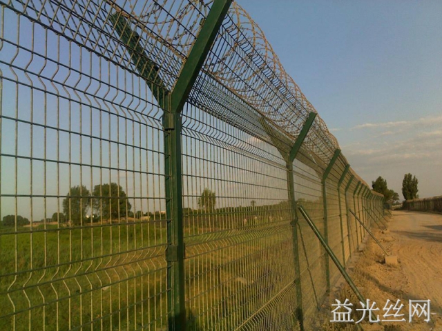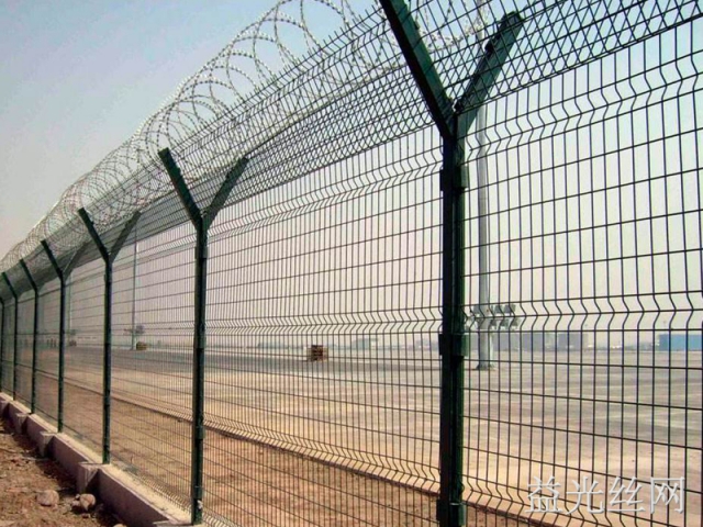 機場護欄網(wǎng)的主要規(guī)格是:整體高度2.5米,寬度3米。立柱采用60×60方管,網(wǎng)片采用3.5-4.0mm低碳鋼絲焊接,網(wǎng)孔一般為50×100mm,50×200mm及60×120mm等。表面處理一般采用鍍鋅 噴塑的雙層防腐處理方式。也有部分地區(qū)為增加抗腐蝕性而采用鍍鋅 浸塑的防腐處理方式,用V型支架立拄,加強型焊接片網(wǎng),安全防盜連接件和熱鍍鋅刀片刺籠組成強度和安全防御性級別很高.使用年限更久可達15年。